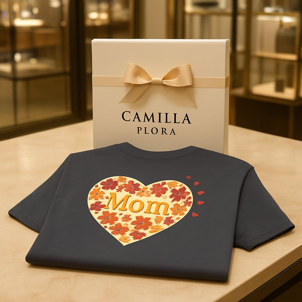 A stylish T-Shirt featuring a design from Camilla Flora with a Mom & Daughter photo together. Perfect for showing love and appreciation to your mom. Makes an amazing gift for the special occasion.